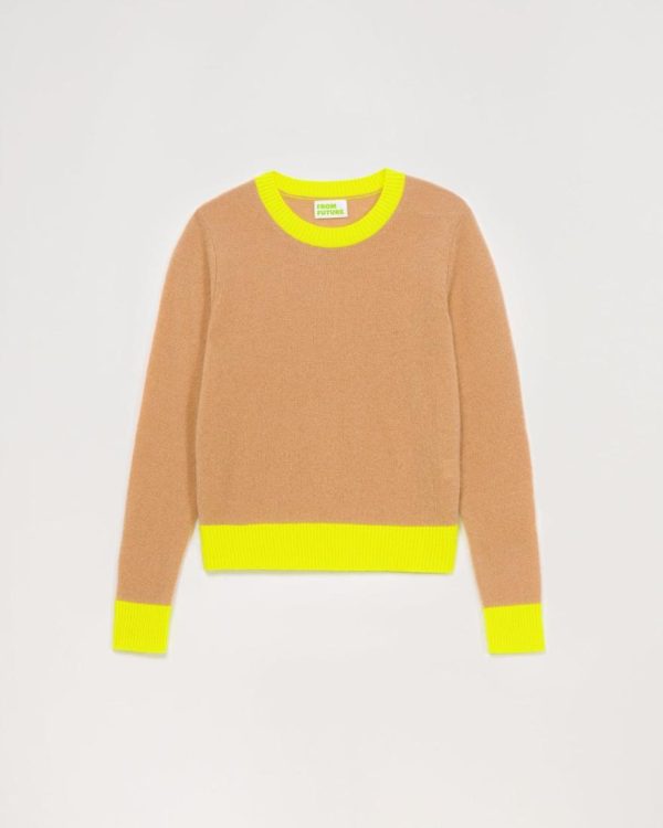 FROM FUTURE Cols Ronds Cachemire | Pull Col Rond Bicolore Léger Camel Femme