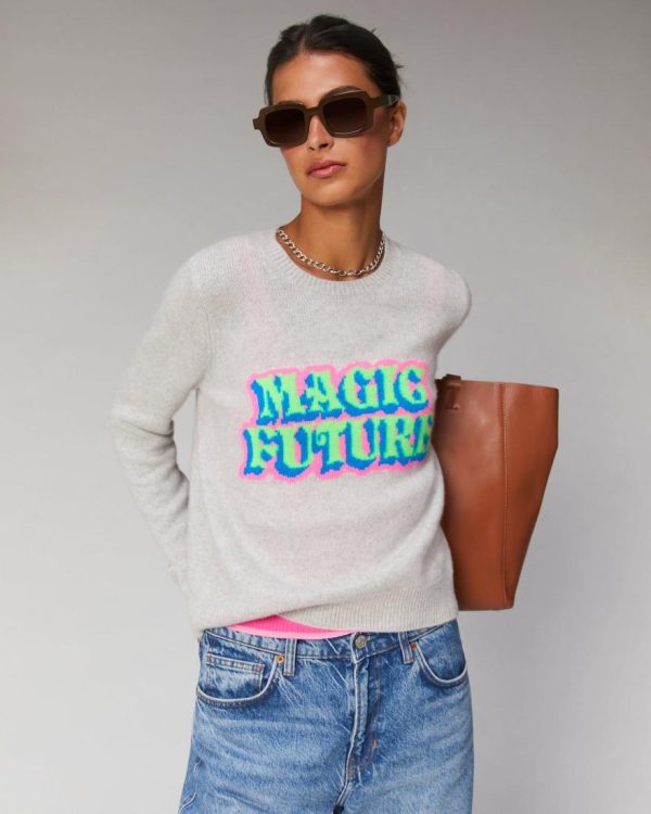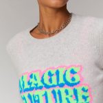 Confectionné en cachemire 2 fils, ce pull court vous transporte vers un futur étincelant de possibilités infinies. Muni d’un col rond, de manches longues et de bords côtelés, il affiche un message en jacquard « Magic Future » pour incarner une allure cosmique. À la fois chic et casual, il s’associe facilement à un jean décontracté, un sac et des lunettes de soleil.