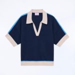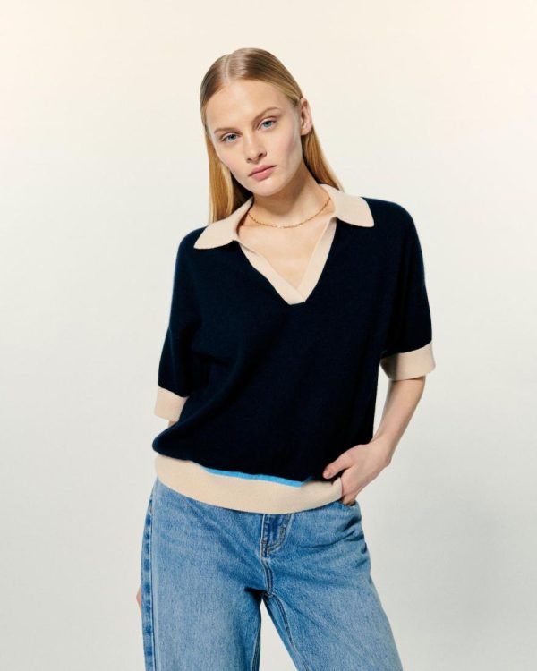 Jeux de lignes pour ce pull court et oversize, en cachemire 2 fils. Muni de manches courtes, il affiche un col polo en V et des bords côtelés contrastés pour transcender votre allure futuriste au quotidien. Mixez-le à un jean ample pour un look chic et casual.
