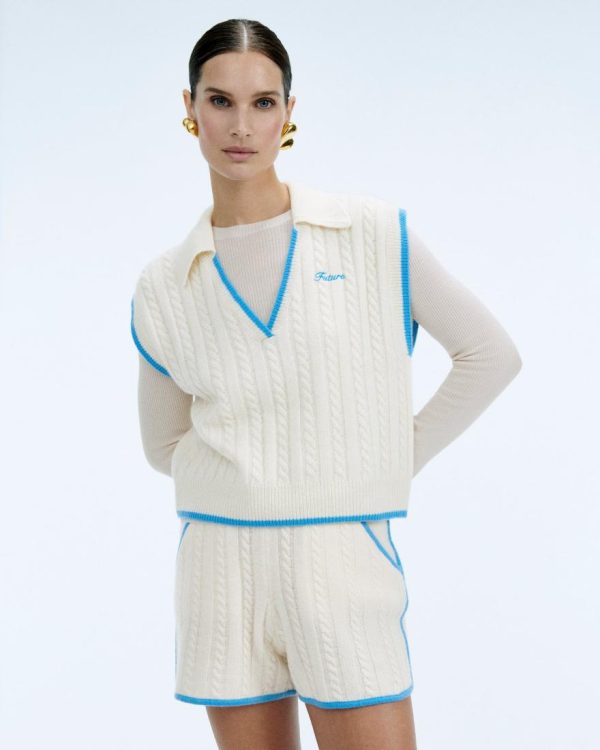Transcendez le temps et l’espace avec ce pull court sans manches muni d’un col en V et confectionné en cachemire 4 fils. Orné d’une broderie signature « Future » sur la poitrine, il dévoile un jeu de torsades et de liserés. À porter seul ou en superposition, mixez-le à un pantalon structuré ou une jupe fluide.
