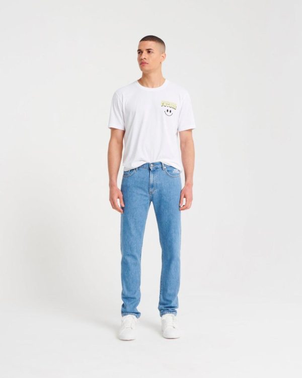 Tout savoir sur Jacob : Jean slim fit. Broderie FROM FUTURE semi-cachée au niveau de la poche gauche. Jacron coloré à l’arrière. Fermeture par boutons siglés sur le devant.