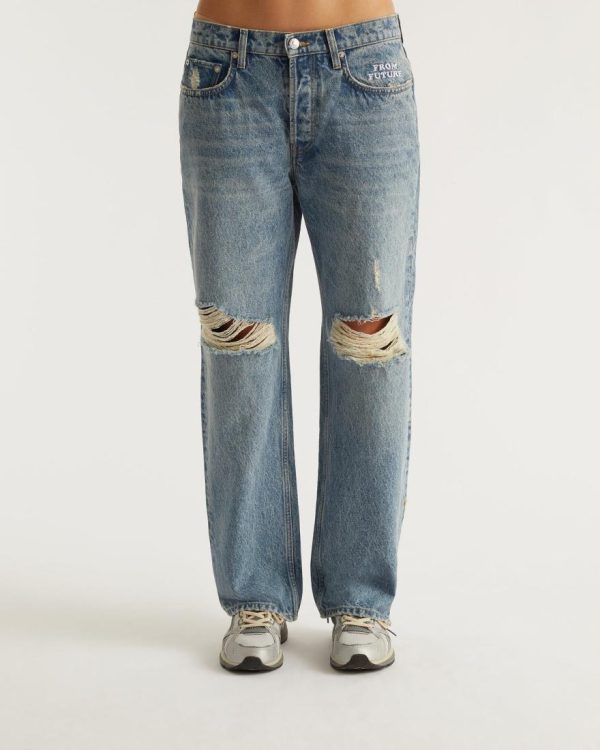 « Résolument cool, le jean Jonah muni d’une coupe droite dévoile des trous, de multiples poches et une broderie « »From Future » ».